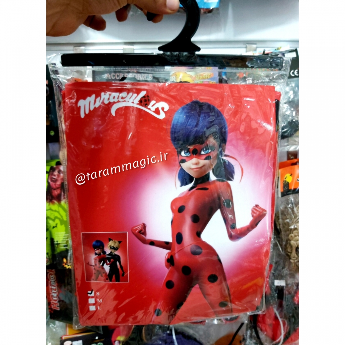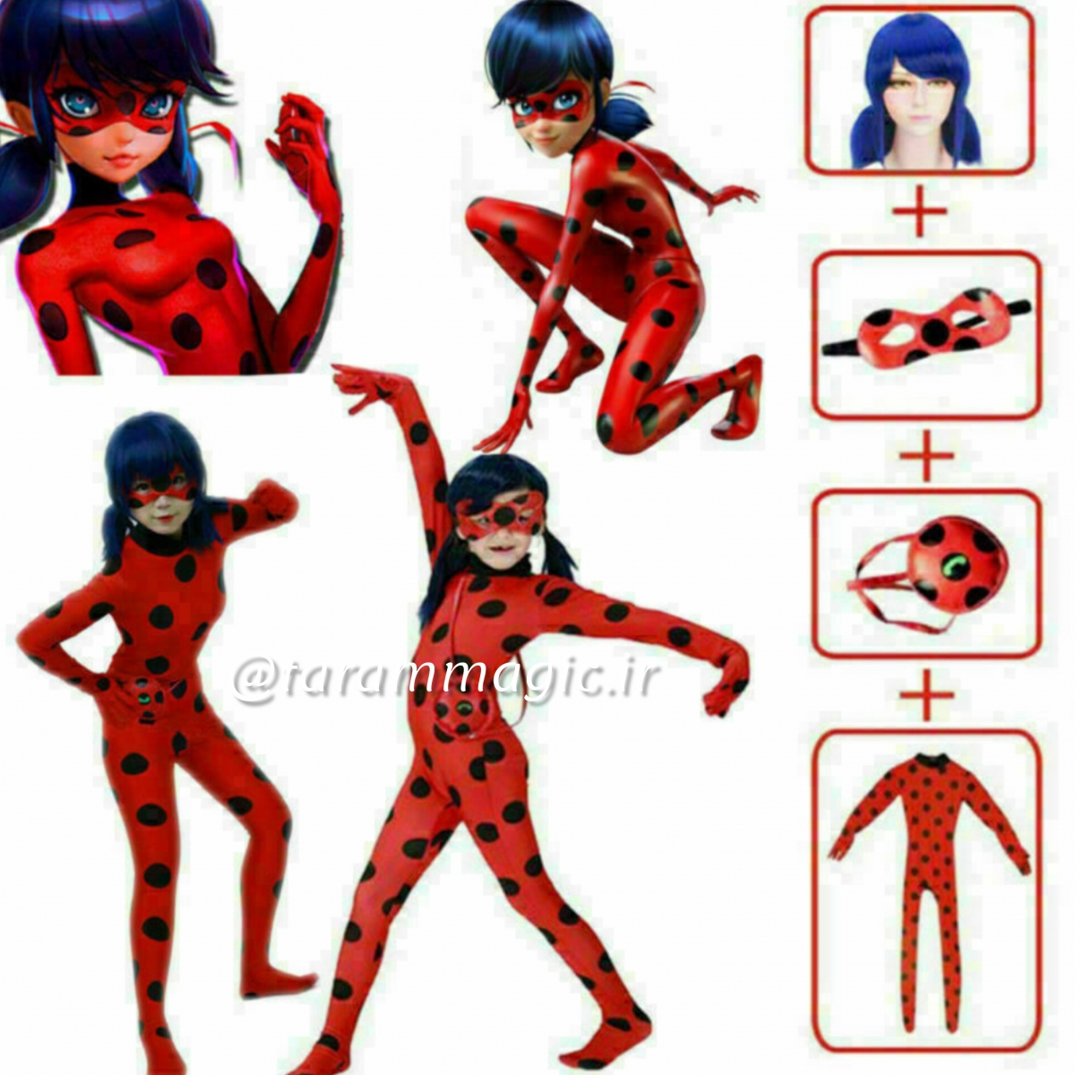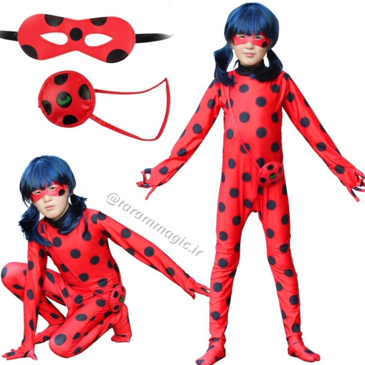 تن پوش یکسره که جوراب و دستکش به خود لباس چسبیده است که در مدل ایرانی اینطور نیست به علاوه نقاب و کیف یویو و کلاهگیس دختر کفشدوزکی کادویی زیبا به دختر بچه هایی است که عاشق این شخصیت کارتونی هستند. این لباس در سایزبندی S-M-L و در سنین 4 سال تا 12 سال بسته به جسته و قد موجود میباشد.